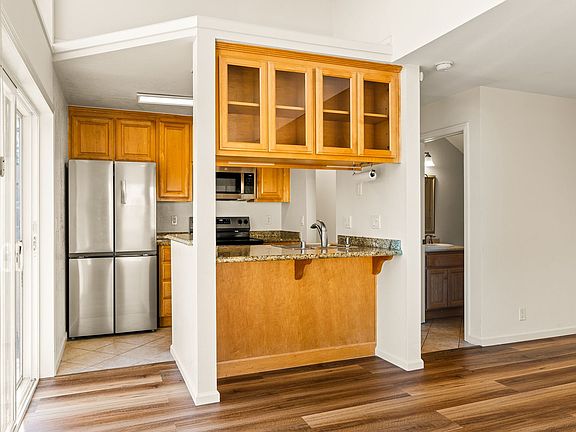 The open-concept layout includes a spacious living area that flows out to a private balcony, where you can unwind and enjoy serene views of the Mission Hills. The updated kitchen is a chef's delight, complete with elegant stone countertops, a convenient breakfast bar, and a full suite of stainless steel appliances, including a refrigerator, stove, dishwasher, and microwave.