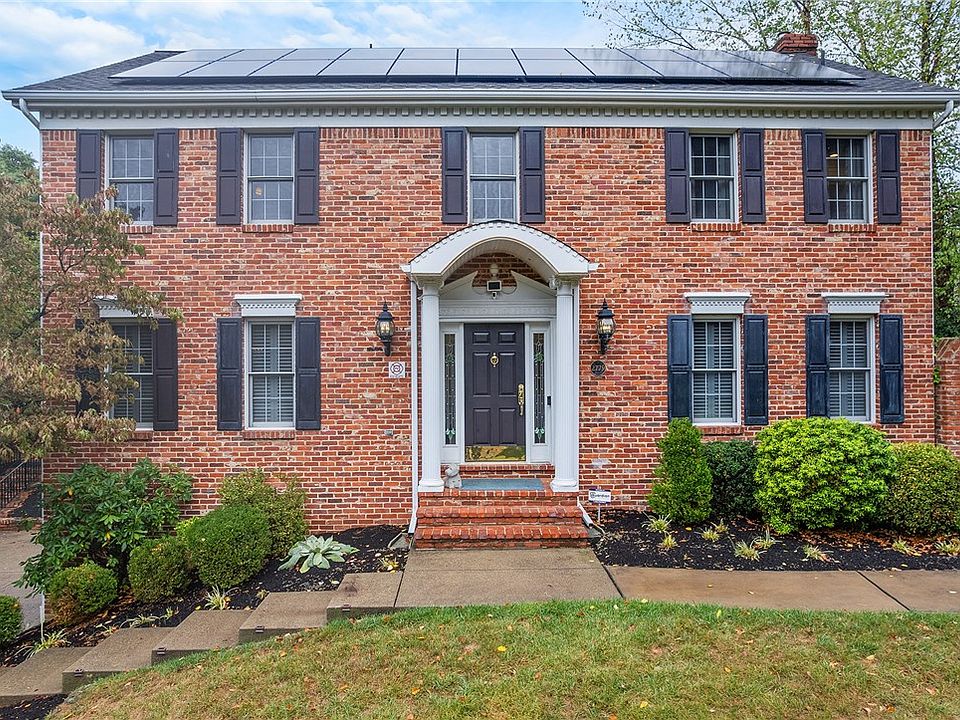 Main-level primary ensuite plus a second upper level primary ensuite, Hampton Twp SD | 4,500+ sq ft custom brick, fully owned solar panels, whole-house generator, dual HVAC & tankless hot water. The serene primary includes a cozy reading nook overlooking the tranquil fish-pond, spa bath w thermo-masseur tub & oversized walk-in closet. Skylights & Swarovski chandeliers enhance hardwood, wainscot, fresh neutral paint, new carpet & plaster moldings. Chef’s kitchen features JennAir/KitchenAid, exotic granite, pot filler, Silgranit dual sink, and built-in pantry. Step outside to covered Trex deck designed for mindfulness & connection with nature. Framed by landscaping and the gentle sound of the cascading waterfall, the backyard offers a harmonious space for morning tea, twilight dining, or quiet reflection.