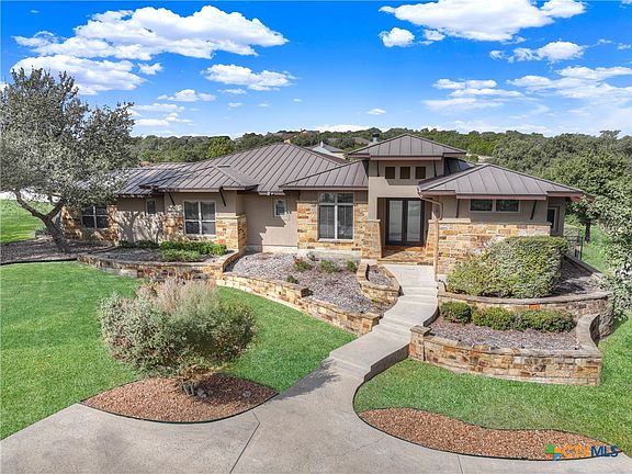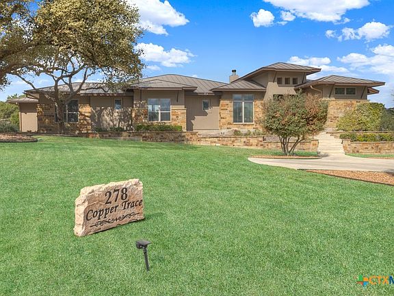 Stunning David Mills custom home in gated Copper Ridge! This luxury 4-bedroom, 3.5-bath residence sits on a 1-acre park-like corner lot with a private gated rear entry and exceptional curb appeal. Mature oaks, professional lighting, sprinkler system & elevated stone beds surround this elegant property, offering both privacy & beauty in one of New Braunfels’ premier Hill Country communities. Inside, the open-concept floor plan showcases hardwood floors, soaring ceilings, & picture windows that fill the home with natural light. The spacious living room features gas fire logs & trayed ceilings with dimmable lighting. The gourmet kitchen boasts granite countertops, Bosch stainless appliances, Thermador gas cooktop, soft-close drawers, & a large walk-in pantry. The oversized primary suite includes dual vanities, honed granite counters, a soaking tub, & a large walk-in shower with a rain shower head, plus a custom closet with built-ins. Three of the four bedrooms include private ensuites, upgraded carpet, & ½” memory foam pad with spill guard. All bedrooms feature walk-in closets. The fourth bedroom, located near the front door, is currently used as an office. Additional features include a dedicated office, game/theater room, mudroom area with built-in bench, & a laundry room with granite counters, sink, cabinetry, & space for a refrigerator. The epoxy-floored garage offers 2 workrooms, tankless water heaters, water softener, extra attic decking, & the home is wired and equipped with speakers for surround sound inside & out. New main AC unit (April 2025) ensures year-round comfort. Step outside to your custom Keith Zars pool, perfectly positioned for privacy with no rear neighbor in view. Enjoy walking distance to the community park, pickleball and basketball courts, pool, pavilion, & mailboxes. Experience luxury Hill Country living in New Braunfels—a rare combination of craftsmanship, comfort, and lifestyle in Copper Ridge.