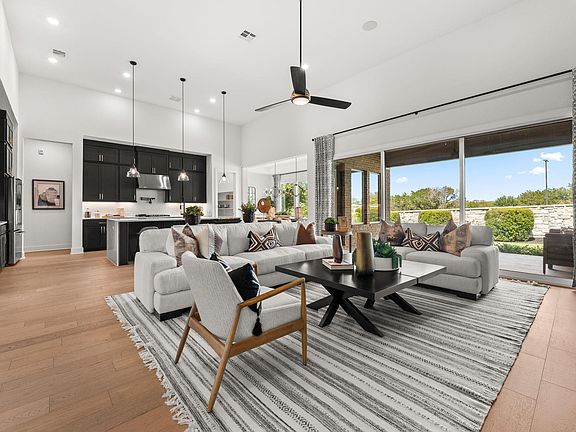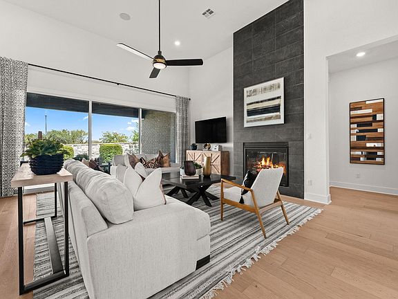 A beautifully designed Taylor Morrison model home in the highly sought-after Six Creeks community of Kyle, TX, offering a thoughtful floor plan, elegant finishes, and stellar indoor–outdoor living. A rare large one-story with four bedrooms, three full baths and one half bath, four living spaces, and over 3,388 sq ft. of living space! A charming courtyard entry creates a cozy first impression before stepping through the striking modern steel front door into a wide, light-filled entryway. At the heart of the home, soaring ceilings and expansive windows fill the open-concept living and kitchen area in natural light. The living room centers around a beautifully tiled fireplace. The kitchen is stunning and functional, with cabinetry that extends to the ceiling, built-in appliances, and tons of counter and storage space. A huge walk-in pantry offers incredible storage capacity. A dining area is off the kitchen, surrounded by windows. The owner’s suite is a retreat with tray ceilings, large rear-facing windows, room for a sitting area, and a huge walk-in closet with storage space. The ensuite bath is beautifully finished with dual vanities, a soaking tub, a dual-head walk-in shower, and windows that bring in natural light. A secondary hallway leads to three guest bedrooms and a bonus living area. One bedroom serves as a junior suite with its own private full bath—ideal for guests or multigenerational living. Two additional bedrooms share a Jack-and-Jill bathroom with a separate vanity area. A versatile bonus space off this wing provides room for a playroom, homework station, or secondary lounge. A front office offers a quiet space for remote work. There’s a dedicated media room, a large laundry room with built-in cabinetry, a folding counter, and a sink. The two-car garage has an extra storage/workshop area. The covered back patio has walls on three sides and tile flooring and the triple glass sliders create a seamless connection to the living room.