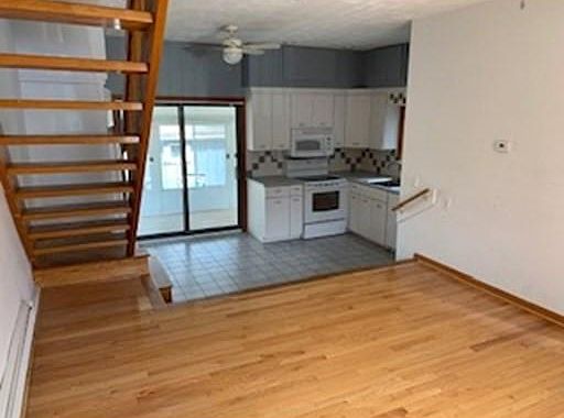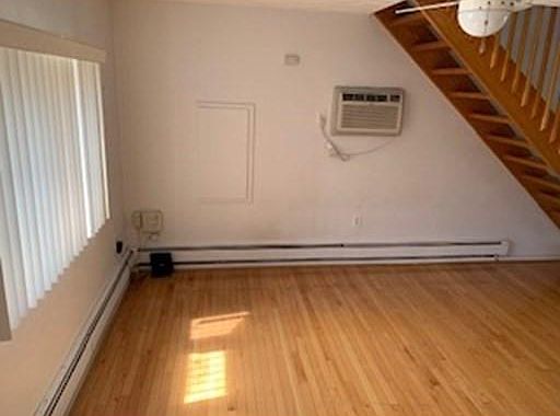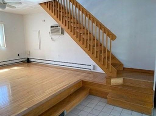 Spacious townhouse style 1 bedroom apartment. 1 off street parking. Rent includes, heat, hot water and electric. Dogs are welcome (pet fee) Entry foyer. Half bath with stack washer dryer/laundry on 1st floor. Living room with hardwood flooring and bay window opens up to a step down kitchen area with slider to an enclosed unheated sunroom. Upstairs is an office space with bay window, cedar closet and full bathroom and a large bedroom with vaulted ceiling and skylight. Available immediately.