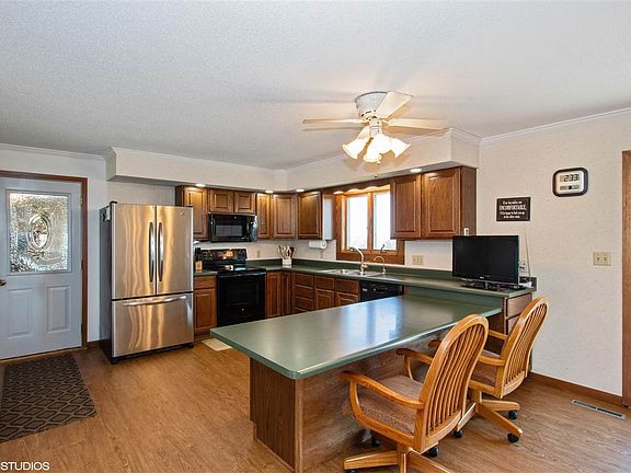Enjoy watching the sunrise while looking over 33 acres of rolling crop, pasture, and timber ground. This country home has many updates, new Anderson windows, insulated vinyl siding and lower level bath with tiled shower in 2013, main floor bath with tiled shower& floor with oversized tub in 2015, and LVT flooring for kitchen in 2019. The lower level family room has plenty of natural light, gas fireplace, and a walkout to a patio. 2 non-conforming bedrooms and laundry room round out this space.