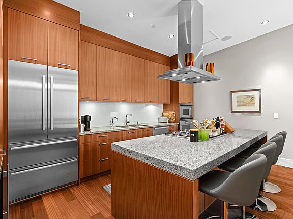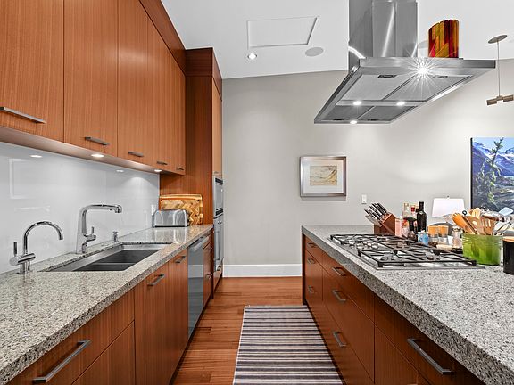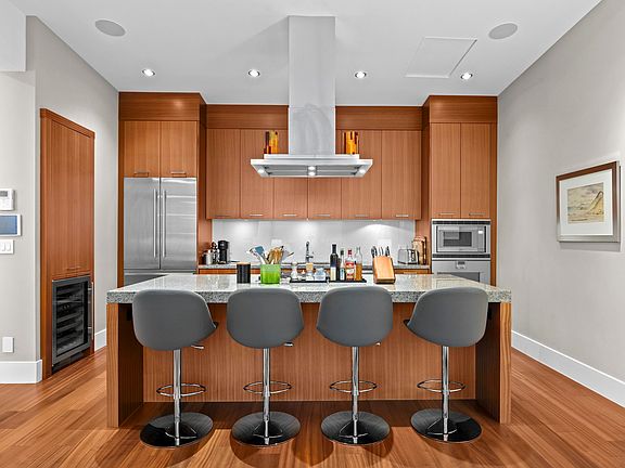Experience ultimate luxury in this rarely available home at the "Terraces at Highgrove" Ideally situated on a private cul-de-sac at the crown of the complex - this home offers an ideal floor plan on 2-levels with entry level access and panoramic views from all vantage points. Concrete home that has been updated throughout; cherry hardwood flooring, Miele/Gaggeneau/Liebherr appliances, custom wine storage and millwork throughout, double sided fireplace, vaulted ceilings, A/C and smart home wired. Large primary with custom walk in closets and spa like bathroom, secondary bedroom w/ensuite and a 3rd bedroom that can be used for guests. Oversized south facing terraces on both levels with views for days. Comes with attached private 2 car garage & storage. Make your downsizing dreams a reality.