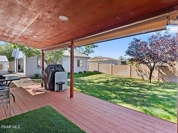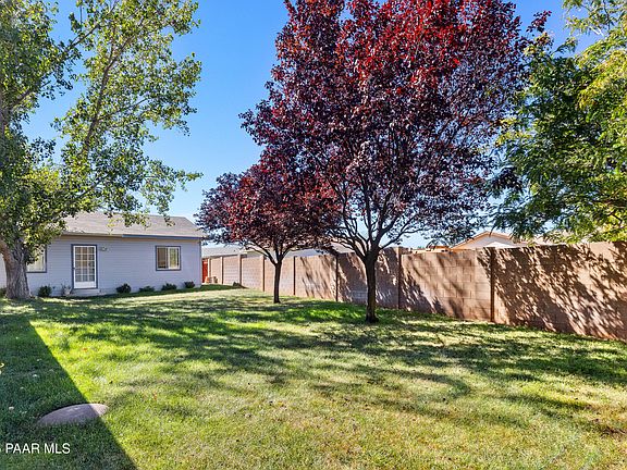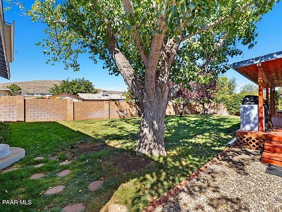 This home in Prescott Valley offers a bright and welcoming appeal, starting with its vibrant yellow and hot pink rose garden. The fragrant rose bushes lead to a charming 3-bedroom, 2-bathroom residence featuring an open-concept living, dining and kitchen area, along with a convenient laundry room. The versatile recreation room is ideal for various entertainment options. It includes an electric baseboard heat, sound wiring, a granite countertop bar, and a portable air conditioning unit, all of which convey with the property. Additionally, a 4x8 1940's pool table with ball returns, new felt, and all accessories are included. The primary bedroom boasts a large jetted tub and a walk-in closet. For car enthusiasts, the property offers a 3-car tandem detached garage and workshop, complete with bright windows and a door leading to the lush green backyard. This backyard oasis provides expansive, direct views of Glassford Hill, mature trees for shade, a covered patio, and a 6-foot brick privacy wall. The side yard features locked red barn gates, providing easy RV parking access. A 10x20 Caravan Canopy, enclosed on all four sides, can either convey with the property or be removed by the seller before the close of escrow. The seller is also including a year Select Home Warranty. The sellers are motivated and ready to sell, so don't miss the opportunity to make this home yours.