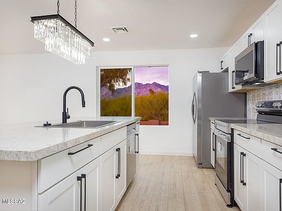 Beautifully remodeled 4-bedroom, 3-bathroom home w/ mountain views. Open floor plan boasts AquaGuard wood flooring throughout, modern kitchen with quartz countertops, large island, ceramic backsplash, and new stainless-steel appliances. The primary suite features a luxurious stand-alone tub and walk-in shower. New dual-pane windows, doors, and a roof with warranty ensure lasting quality. The exterior showcases a Dryvit synthetic stucco system with built-in color, never paint again! Family room with cozy fireplace and wet bar. Newly plastered pool,new filter, light, and equipment, perfect for entertaining. Great neighborhood in Tucson Location Location Location. Adjacent to a green belt and close from Udall Park and Bike loop.