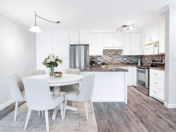 This stunning 2 bed, 2 bath condo offers 1000 SF and no wasted space. The open-concept kitchen, living, and dining area featuring beautiful designer laminate flooring is flooded with natural light. The gourmet kitchen is a chef's dream, perfect for entertaining, boasting modern white shaker cabinets, a large pantry, big island, and tons of counter space. Spacious living room leading to the large covered balcony. FULL LAUNDRY ROOM and tons of in-suite storage. The 2nd bedroom is spacious and makes a great kids room or office. Retreat to the huge master suite, complete with a big walk-in closet floor to ceiling dressing mirror! The updated ensuite boasts a gorgeous glass and tiled shower. Central location close to all your shopping or transit needs! OPEN HOUSE - SUN, NOV 30TH - 2-4PM