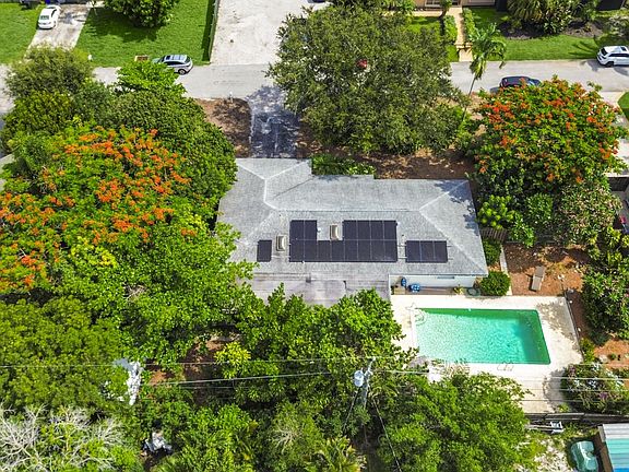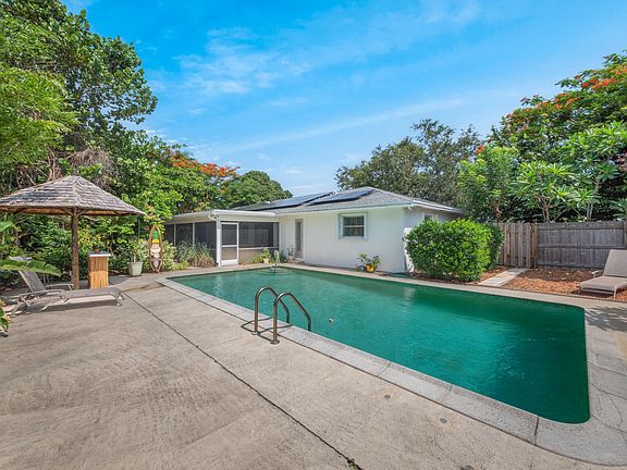 Rare pool home with lush, mature native vegetation. Just 2.7 miles from the Ocean in the Floral Park subdivision. Double lot with shaded, fenced yard means room to expand, including second driveway vehicle access through gate. No lawn maintenance or irrigation needed. Two car garage. 16'x10' shed with electric. Expansive 40' screened lanai by the pool. Solar power and irrigation well keep utility costs low. Shaded outdoor hot shower. This unique tropical oasis cannot be duplicated. 102 species of plants, eight different Florida fruit trees and butterflies galore. Poolside tiki bar. 30 watt service outlet for RV in side yard. Generator service outlet in garage. Spacious den can be 4th bedroom. En-suite bath opens to pool deck. Voluntary $50 annual POA dues with no restrictions. Outside city limits and just two blocks from Lake Osborne Park.