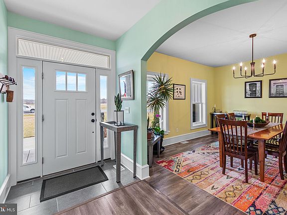 This stunning custom-built home in Milton, Delaware, offers ample space for future additions like a pool or pole barn, while embracing its serene surroundings with exceptional design. Nestled amidst rolling hills, lush trees, and fertile farmland, this home beautifully blends coastal charm with modern farmhouse elegance. From the moment you arrive, the classic board-and-batten exterior, welcoming front porch, and carefully manicured landscaping make a lasting impression. A winding pathway enhances the curb appeal, leading you into a home where superior craftsmanship is on full display. Inside, the home boasts large-format tiles, wide-plank laminate floors, nine-foot-high ceilings, and solid-core doors. The open-concept living areas are flooded with natural light from oversized windows and skylights that illuminate the two-story living room. A floor-to-ceiling stone fireplace serves as a captivating centerpiece, offering both warmth and sophistication. At the heart of the home is the chef's kitchen, equipped with a breakfast bar and an adjacent dining area that offers panoramic views of the lush lawn and gardens. For formal gatherings, a pass-through connects to the dining room, framed by stunning country vistas. The main-level primary suite is a true retreat, featuring two walk-in closets with custom storage, and an ensuite bathroom that exudes spa-like luxury with dual vanities, a spacious stone-tiled shower, soaking tub, and private water closet. Adjacent to the foyer is a dedicated home office, along with a well-appointed laundry and mudroom providing custom storage and access to the 2-car garage and workshop. The second-floor features a loft-style family room with a dry bar and beverage fridge, perfect for entertaining. Three additional guest bedrooms offer unique amenities such as ensuites, walk-in closets, cathedral ceilings, and sweeping views of the countryside. Additional spaces include a hall bath and two floored open-truss rooms ideal for a craft room or home gym. The home's charm extends to the outdoor spaces, with a fenced rear yard, screened porch for morning coffee, and inviting outdoor living areas perfect for enjoying the surrounding natural beauty. This residence offers a harmonious blend of elegant design, comfort, and functionality.