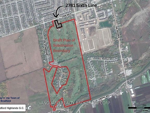 A prime investment opportunity to acquire 1.631 acres of land located at the main entrance of Bradford's largest upcoming residential subdivision with 998 homes, the Bradford Highlands(former Bradford Highlands Golf Course). This exceptional corner lot boasts over 110 feet of frontage on Sixth Line and over 427 feet along the future main entrance of the subdivision,offering high visibility and exposure. Strategically positioned within a rapidly growing community, this property presents endless potential for future development, including commercial use, a small plaza, gas station, or residential projects (subject to approvals). With ongoing residential expansion and a surging local population, this parcel offers outstanding potential for investors and developers seeking to establish a presence in one of Bradford's most desirable growth areas.Its size, location, and direct adjacency to new subdivision lands make it a valuable long-term addition to any real estate portfolio. A 5 bedroom, 2-storey home with over 2,300 sq. ft. of above-ground living space adds further value to the property ideal for rental income or as a comfortable residence while capitalizing on future development potential.