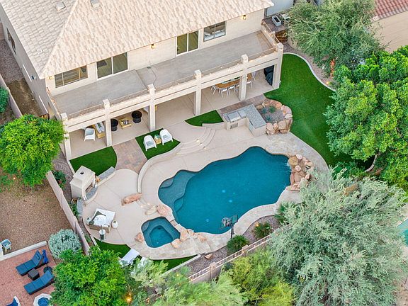Step outside to your own desert sanctuary complete with a heated pebble-finish pool and spa, boulder waterfall, wood-burning fireplace, built-in BBQ, and artificial turf lawn framed by mature desert landscaping.