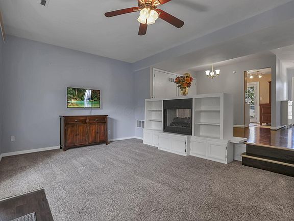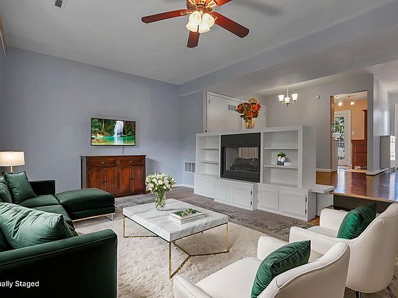 One of the rare condominiums in The Landings that backs directly onto green space, this home offers a private and serene retreat. Step inside to a welcoming foyer that leads to the dining area and a spacious sunken living room, separated by a striking double-sided fireplace—perfect for cozy evenings. The living room is highlighted by an expansive three-panel sliding glass door, filling the space with natural light and leading to a private patio overlooking the greenery.