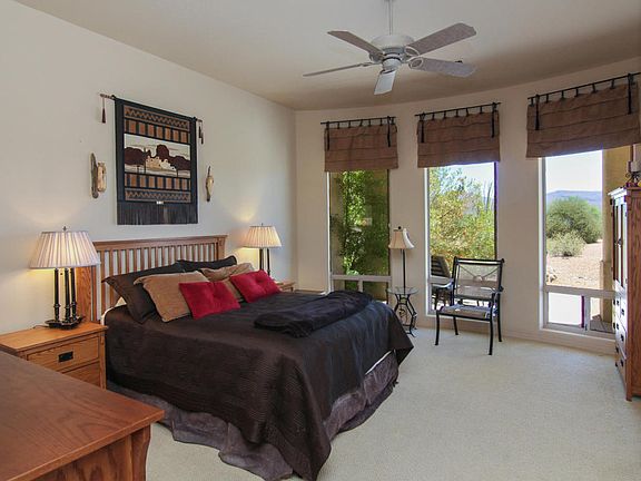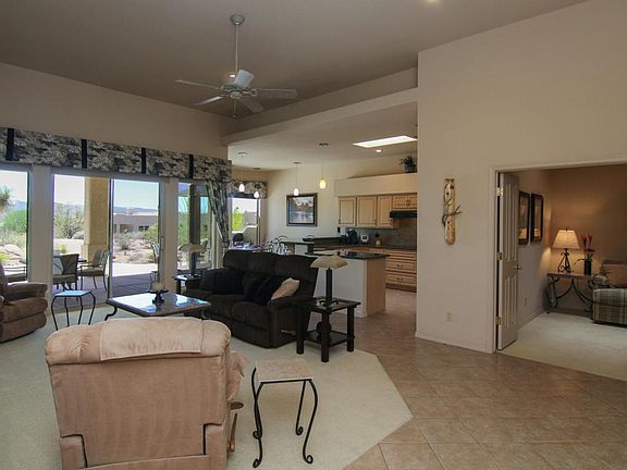 Enter this gorgeous 2 bedroom/2 bathroom plus den home located in a gated golf course community to a private courtyard that leads to an inviting great room with amazing mountain views, gourmet kitchen offering granite counter-tops, breakfast bar, generous cabinet space and all appliances conveying; light and airy breakfast room that looks out to the picturesque back yard; split floor plan; private master suite with a walk in closet, dual vanities & shower with dual heads; spacious guest bedroom with walk in closet, inside laundry with built in cabinets and washer & dryer conveying; covered back patio set up to relax and enjoy the tranquility of the desert. This turnkey home can be sold with all the tasteful furnishing making your next move a matter of just bringing your clothes.