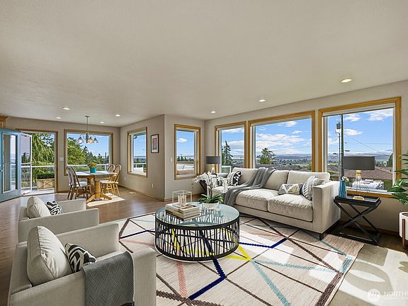 Beautiful Panoramic views of Port Susan & Skagit Bays, Olympic Mountains & Breathtaking year-round Sunsets! Open floor plan ~ living & dining areas, kitchen w/ custom maple cabinetry, walk-in-pantry, SS appliances, Lg Island & gas stove-top. Gas fireplace w/ built-in's & high-end laminate flooring. Main floor Primary suite w/ a Lg walk-in closet + ensuite w/ a jetted tub & walk-in-shower. 2nd bedroom, den, laundry & 3/4 bath complete the main floor. Multigeneration/ADU/MIL ~ Lower-level w/ it's own separate entrance, kitchen, dining, sitting area, bedroom & full bath. Mature landscaping, fenced in garden area, RV parking + 3-car garage. New Roof in 2023! Great Opportunity to live in one of Stanwood's most desirable areas. Virtually staged.