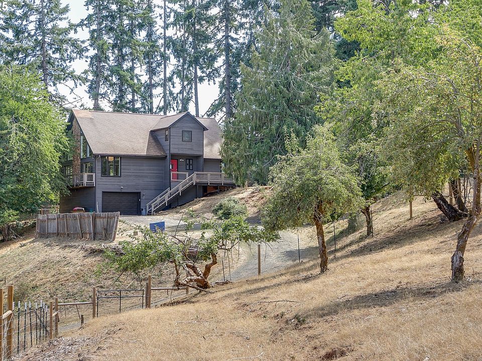 Situated on 2.69 acres, this Northwest contemporary home has been thoughtfully updated with a modern kitchen featuring stainless steel appliances and a marble-topped island. Interior highlights include madrone wood flooring in the living area, a ductless heat pump, pellet stove, upgraded electrical panel wired for a backup generator, and a water filtration system.The property offers sweeping views of the Lorane Valley and convenient access to King Estate Winery, local vineyards, mountain bike trails, and outdoor recreation. Exterior improvements include new perimeter and cross fencing, a shed barn, tractor shed, garage door, and a flat area ready for gardening. Multiple barns and sheds support small-scale farming with space for chickens, goats, or other small livestock. A sauna and outdoor clawfoot hot tub further enhance the lifestyle amenities, creating a versatile property that blends recreation, agriculture, and relaxation.