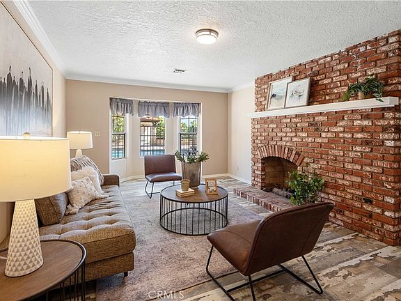 As you enter the main house, you are greeted by a formal entryway that opens into a sophisticated living room, featuring a bay window and a classic brick fireplace. The adjoining family room exudes warmth with its own brick fireplace, crown molding, and plantation shutters that frame the sliding doors leading to the inviting pool and spa. A cozy sitting window and vaulted wood-beamed ceilings further enhance the charm of the open floor plan.