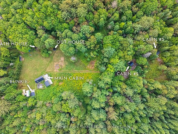 Welcome to The Land, your private off-grid escape on approximately 100 acres of natural beauty.Ideal for seasonal enjoyment! Relax and unwind in this turn-key retreat, featuring a main cabin, bunkie, a charming three-season room, two more cabins for your guests, bathhouse, outhouse, with plenty of room to enjoy nature. The main cabin includes a modern kitchenette, loft sleeping area, and generous storage space, it is also set up with propane for your lighting and cooking needs, along with a wood stove to keep cozy on the colder nights. The bunkie and two cabins are thoughtfully set up with their own kitchenettes, offering comfort and independence for you and your guests. The old field stone foundation has been artfully repurposed as a unique fire nook amongst a magical garden. Multiple outbuildings provide additional storage for all your year-round recreational gear. Explore the extensive network of level trails that wind through a beautiful mixed forest, including a beautiful pine clearing. The Land is bursting with wild blueberries, raspberries, and an abundance of local wildlife. These scenic paths lead to a peaceful pond, perfect for paddling, relaxing, or simply connecting with nature. The property offers breathtaking views of the night sky, ideal for stargazing, watching meteor showers, or simply enjoying the quiet magic of the cosmos. Whether you're looking for a quiet getaway, a family retreat, or a base for outdoor adventure, The Land offers a rare blend of privacy, comfort, and untouched natural beauty. Located on a year-round municipally maintained road you can enjoy the outdoors all year long. Well water flow rate is low; suitable for recreational or seasonal use only. Buyer to verify water system meets intended use.