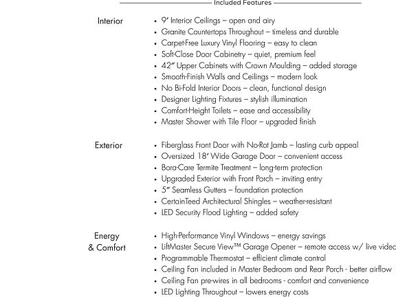 This thoughtfully designed home features 9' ceilings, granite countertops, and carpet-free luxury vinyl plank flooring throughout. The kitchen boasts 42'' upper cabinets with crown molding, soft-close drawers, designer lighting, and a clean, functional layout. You'll love the smooth finish walls and ceilings, comfort-height toilets, and tile-floored walk-in shower in the spacious master suite, complete with a double vanity and large walk-in closet.