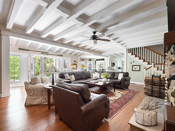 Sited beneath a canopy of mature Pines, Cedars, and Dogwoods, this beautifully preserved 1928 lakefront cottage blends timeless character with thoughtful updates—offering the ultimate year-round retreat for family and friends. Ideally located in a sought-after historic neighborhood, you're just a short stroll from your own private ½ double dock, the water’s edge, and beloved local amenities. The home’s inviting exterior features classic wood shingle siding and split granite accents, setting the stage for the warmth and charm found inside. Step into the spacious great room, where vaulted beamed ceilings, a striking red-rock fireplace, and panoramic French doors create a cozy yet expansive living area filled with natural light. These doors open to a stunning stone patio, where a seasonal creek meanders by—perfect for enjoying tranquil mornings or lively gatherings. The open layout seamlessly connects the updated kitchen, main living area, and serene outdoor spaces, making entertaining effortless. A cozy bunkroom with an adjacent bathroom and a separate workshop complete the main level. Up a small staircase is a peaceful bedroom with a charming bay window, along with a full bath. The upper level also offers two additional bedrooms—one a bright guest retreat with vaulted ceilings and skylights, the other an oversized primary suite tucked among the treetops. A fully remodeled bath and a flexible bonus room (ideal as an office, nursery, or den) complete the upper floor. This rare lakefront property features level pathways that lead to your private dock with a metal canopy, sitting area, and beach—just across from the iconic Lone Pine Island. In the opposite direction, the trail quickly leads to Burnt Mill Beach Club, a popular local brewery, and nearby resort. Additional highlights include a whole-house Generac generator, central air conditioning, a well-appointed single-car garage, and parking for 4+ vehicles. A true four-season getaway, this property is a rare opportunity to own a piece of lakefront paradise—blending historic charm with modern comfort in one of the mountain’s most cherished settings.