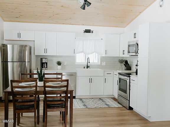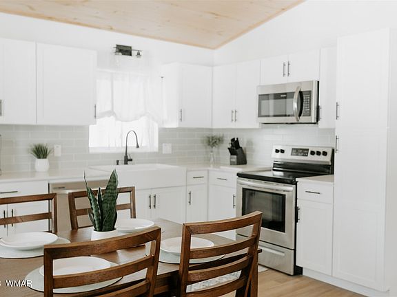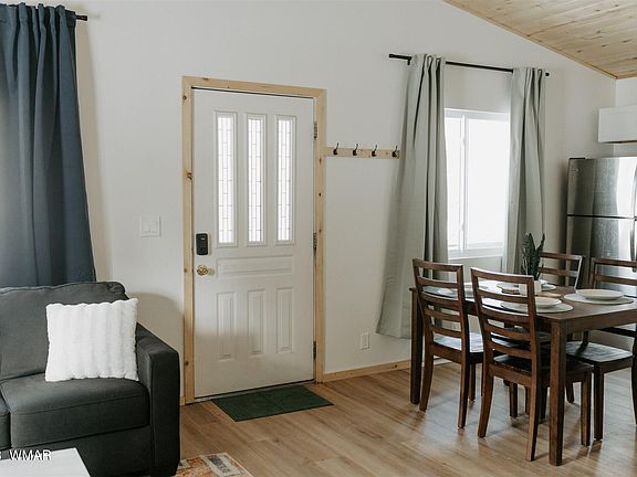 Beautiful REMODELED cabin on 1.25 acres of TALL PINES with NO HOA in Section 31! Every room in this cabin has been updated since November 2022. This cabin is FULLY FURNISHED and has a new septic tank (December 2022). The cabin has 2 bedrooms (Master has an attached 1/2 bath with washer/dryer), 1.5 bathrooms with open kitchen, dining and living room. The main areas of the home have vaulted ceilings and all ceilings are a beautiful T&G. The kitchen has been updated with new cabinets, quartz countertops, SS appliances, large farmhouse sink and is fully equip with all the basic kitchen cooking needs! New baseboards heaters have been added along with an electric fireplace. The property has an oversized garage and large quad garage and is heavily wooded with a private well.