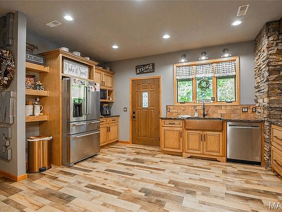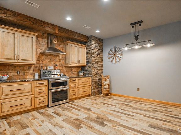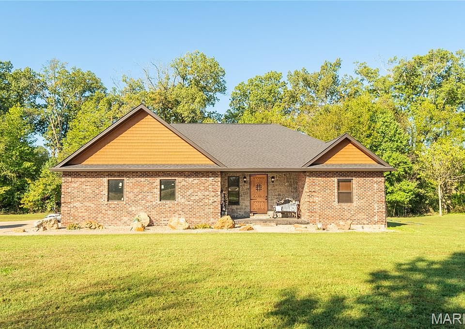 Custom brick and stone home on nearly 3 acres offering high-end finishes and rustic charm. Inside, the gourmet kitchen features Cambria quartz countertops, a copper farmhouse sink, maple glazed cabinets, ledgestone pillars, and a full KitchenAid appliance suite. Both primary baths showcase custom cabinetry, stone sinks, quartz countertops, and tiled showers. The home includes two primary suites with cedar-framed beds, walk-in closets, and hardwood floors, plus an oversized third bedroom currently used as a study and a bonus room perfect for storage or a nursery. The living room offers a warm, rustic feel with a custom stone fireplace wrapped in cedar, vaulted ceilings with custom beams, and a knotty alder front door. Enjoy the outdoors with concrete front and back porches, a 30x30 shop with a 10x30 overhang, and an oversized two-car garage. Quality craftsmanship and thoughtful design make this home a standout property in a peaceful country setting.