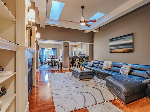 Stunning Open-Concept Home with Luxurious Finishes and Walk-Out Basement. Welcome to this beautifully designed home that seamlessly blends elegance, comfort, and functionality. Step inside to an expansive open floor plan highlighted by 12-foot coffered ceilings with skylights, bathing the spacious living room in natural light. A tiled gas fireplace and custom built-in bookcase create a warm and inviting focal point, complemented by gleaming hardwood floors.  The eat-in kitchen featuring granite countertops, stainless steel appliances, and a generous breakfast bar-ideal for casual dining and entertaining.  Retreat to the luxurious primary suite, showcasing a cathedral ceiling, ensuite bath with a walk-in shower, double vanity, and a spacious walk-in closet. The second bedroom, currently used as a home office, offers rich hardwood floors and custom built-in shelving for maximum versatility.  The full finished walk-out basement extends your living space with a large family room that flows into a stylish wet bar and recreation area-perfect for hosting gatherings. This level also includes an additional bedroom, full bath, and two storage rooms complete with built-in shelving for optimal organization.  Enjoy outdoor living on the deck with a built-in gas line for grilling, or gather around the patio's built-in fire pit for cozy evenings under the stars.  This home truly has it all-luxury, space, and smart design. Don't miss the opportunity to make it yours!