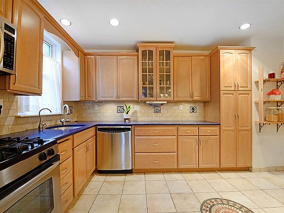 The kitchen has stainless steel appliances, and an abundance of cabinet space.