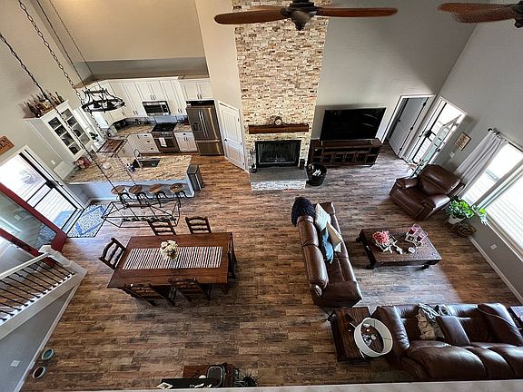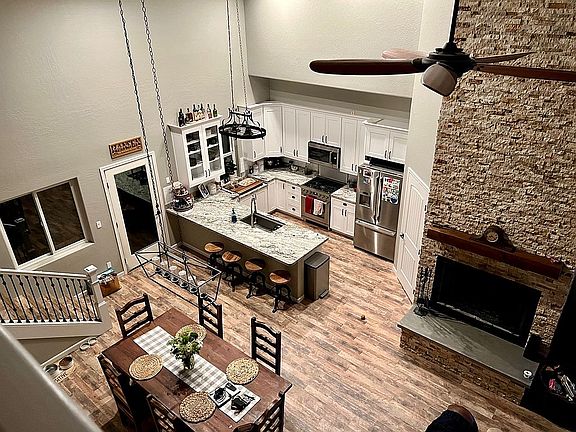 Floor-to-ceiling fireplaceWalk in showerCustom homeWhite cabinetsHigh-end bosch appliancesCovered wrap-around porchGranite countertops
