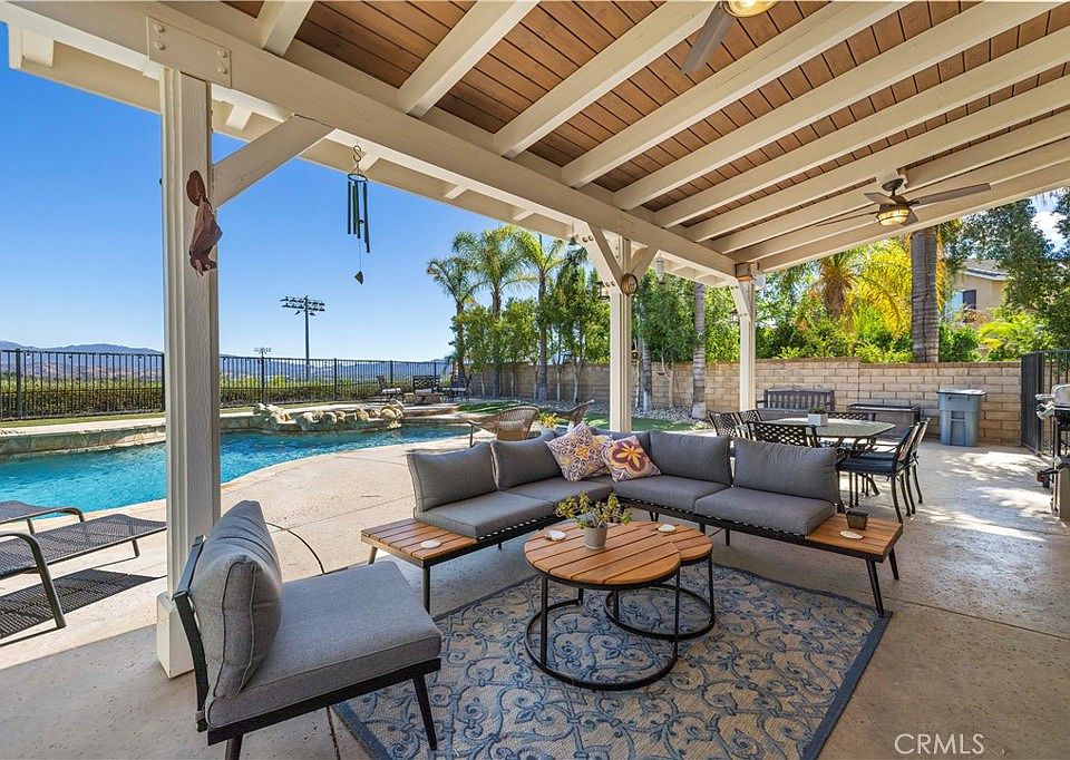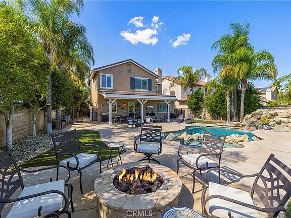 PANORAMIC VIEWS + OWNED SOLAR IN THIS GORGEOUS ALTA VISTA HOME! Welcome to this beautifully upgraded 4-bedroom, 2.5-bath POOL home, perfectly positioned on a premium lot with no rear neighbors, sweeping views of Santa Clarita PLUS perfect views of 4th of July fireworks! This beautifully maintained home offers incredible curb appeal with lush landscaping, nearly 20 palm trees, a cozy covered front porch, plus a spacious backyard designed for entertaining! Inside, you’ll find a bright, flowing layout with recessed lighting, plantation shutters, and tasteful finishes throughout. The upgraded kitchen boasts white cabinetry, granite countertops, a center island, stainless steel appliances including a double oven and beverage cooler, plus backyard views and a walk-in pantry. The adjacent family room is spacious with a cozy fireplace and custom built-ins. A main floor versatile office with built-in cabinetry offers functionality for work or study. Upstairs, the primary suite offers scenic views plus an ensuite bath with dual sinks, soaking tub, and separate shower. Two additional bedrooms share a full bath with double vanities, and a convenient upstairs laundry room completes the layout. Step outside to your own resort-style backyard featuring a sparkling saltwater pool with waterfall feature, relaxing spa, fire pit, and a covered patio with ceiling fan creating the perfect setting to enjoy peaceful evenings and incredible views! New air conditioner and water heater both installed in 2024! With OWNED solar, no rear neighbors, a 2-car garage, and NO Mello-Roos, this is a rare opportunity to enjoy privacy, comfort, and the very best of Santa Clarita living!