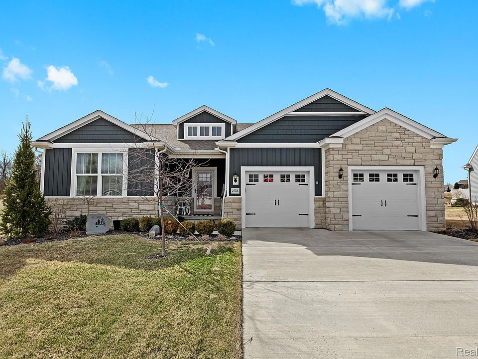 Built in 2020 this gorgeous single story home features an oversized garage, in-ceiling speaker system, partially finished basement, a deck with an awning, custom details and charm with so much more! You will find the great room is full of natural light, tall vaulted ceilings and a stone faced fireplace. The large primary bedroom includes tray ceilings, a walk-in closet and private bathroom with dual sinks and walk-in tiled shower. The custom kitchen features tall cabinets, tile backsplash, under cabinet lighting, newer appliances, including a double oven, quartz countertops & walk-in pantry. Just off the oversized 2 car garage is the laundry and mudroom. The partially finished basement has tall ceilings, plenty of space for storage, prepped for a full bathroom and space for a future bedroom. Washer and Dryer included. Rare to find a single story in such great shape and quality! A must see in person!