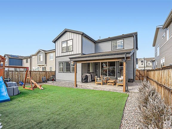 Step into this stunning home boasting an extraordinary outdoor living space! Entertainers and outdoor enthusiasts alike will revel in the spacious covered back patio, featuring stamped concrete, wood paneled ceiling and dual infrared heaters for year-round enjoyment despite the outdoor temperature. The high-quality turf in the backyard, beautiful landscaping and rare privacy fence creates a perfect play or entertaining area. Inside, the gourmet kitchen boasts granite counters, upgraded cabinetry with soft close drawers and stainless steel appliances including a gas cooktop and vent hood. The oversized eat-at island easily seats 4 and is the perfect place for eating a quick meal! The kitchen flows seamlessly into the large great room and dining area, creating the modern, open floorplan that everyone loves. The dining area can be formal or casual and accommodate a table that seats 10! The great room can accommodate the largest sectionals and TVs. An additional versatile space is the formal living room that can be used as a home office or playroom. The master suite offers a 5-piece bath with upgraded tile and a walk-in closet with a closet system for maximum storage. The convenient 2nd floor laundry room keeps you from hauling laundry up and down the stairs! A small, cozy loft is perfect for a desk or reading area. Two additional 2nd floor bedrooms share a spacious bath with dual sinks and upgraded tile! No need for a lawn mower as the front yard also has high quality turf, minimizing the time you need to spend maintaining the landscaping! Assumable low interest VA loan at 2.375%! 220V electric car charger in garage! With upgrades galore and built by Taylor Morrison in 2020, this home embodies modern living! Located in Sky Ranch which boasts spectacular views of the mountains as well as downtown Denver and is only minutes from DIA, the nationally acclaimed Gaylord Center, and Buckley Air Force Base. Sky Ranch has quick access to E-470, I-70, and the metro Denver.