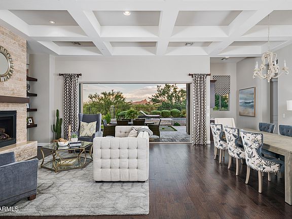 Welcome to the ultimate Contemporary Arizona Lifestyle on 2+ Acres in Saguaro Estates featuring modern contemporary finishes throughout. Popular Split Cholla Floorplan with a courtyard entry, formal Living room with split-face stone fireplace, wood floors, formal dining area adjacent to recessed bar area with beverage center, coffered ceilings and automated pocket door with bulls-eye view of Pinnacle Peak and the McDowell Mountains. Dream Kitchen open the family room area boasts large island, upgraded white cabinetry with glass doors, light grey subway tile backsplash, gorgeous gray and white granite counter tops, Jenn Air Stainless Steel Appliances, dual ovens, bench seating and walk in pantry. Second automated pocket door off great room area to main patio, pool and spa. Massive owner's suite with his and her walk-in closets and bathroom vanities Separate tub and dual entry shower and a Cozy patio off master bedroom. Dedicated office/playroom with walk in closet and with window to courtyard, Powder room features cantilevered granite counter with bowl sink and custom faucet. 3 Room Guest House with separate entrance off courtyard featuring dedicated living room bedroom and bathroom Guest wing includes laundry room, ensuite bedroom and two bedrooms sharing a Jack and Jill bathroom. Outdoor living at its finest with multiple outdoor patio's, Geometric play pool with sun shelf, raised seating area next to pool with fire feature, tiered stone waterfall feature and raised oversized spa with spill over features and two separate turf areas on each side of yard. Great indoor and outdoor sound system throughout the house. Fun, fenced inside yard complete with sport court/basketball, kid play area, and space for dogs. Side entry Oversized 3 car garage, dual tankless water heaters and storage. Rare circle drive and private mailbox. Note House is one acre away from adjacent road. Furnishings available per separate agreement.