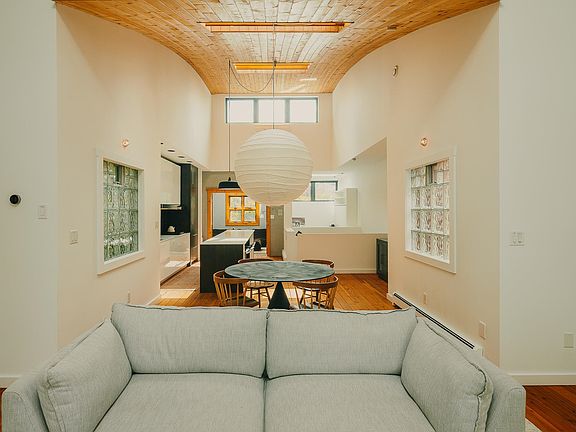Architect-designed home by Prix de Rome winner A.A. Robins—an industrial-modern residence off Main Street. Formerly known as the Cone House, this home has been reimagined for modern living. Soaring 25-ft ceilings, clerestory windows, and five skylights bring abundant natural light to the loft-like interior. Featuring a corten steel exterior, heated concrete floors, heat pump, A/C, and HRV system for high efficiency and low maintenance. Flexible layout with a spacious primary suite, two office nooks, and a convertible study and loft. Heated garage. Recent updates: roof, plumbing, kitchen, boiler, windows, EV charger. High-end appliances (Miele, Bosch, Liebherr) and designer lighting by Artemide, Bocci, and Akari. Steps to everything—yet unlike anything. Open House: Sat/Sun, Sept 27/28, 2–4