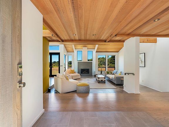 This architecturally distinctive, updated single-level home offers style, spacious living areas, and connection to its coastal surroundings. Situated on a generous lot, the property features a private courtyard and a deck partially glass-enclosed for year-round dining, entertaining or wildlife watching. Sited adjacent to the Sea Ranch Links golf course, its meadow views and ocean glimpses enhance a sense of open space and immersion in nature. The home's architectural design and finishes create a modern coastal aesthetic. Oak floors, abundant natural light, and artful details include RAIS gas fireplace, custom stair railing, cement fireplace facing and bathroom vanities. The primary bedroom features a private deck and ensuite bathroom with soaking tub, open shower, and dual vanity. Updated kitchen features quartz counters and Bosch appliances. A spacious loft can serve as a home office, creative space, or additional guest room. The dedicated laundry room and an attached two-car garage provide ample storage. Located close to scenic bluff trails and a short drive to shops, dining, and medical services, this home is offered fully furnished, a rare opportunity to enjoy coastal living in an architecturally distinctive space. Easy access to Sea Ranch recreation, pools and courts.
