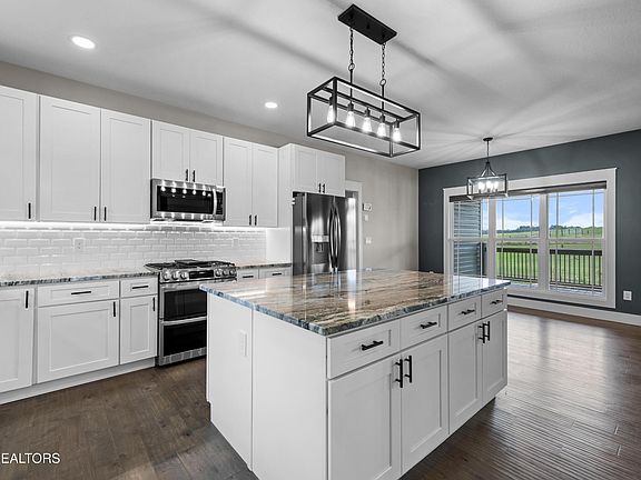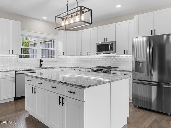 The gourmet kitchen shines with stainless steel appliances, a gas range, soft-close cabinetry, and an oversized marble-granite island that offers abundant workspace, storage, and seating.