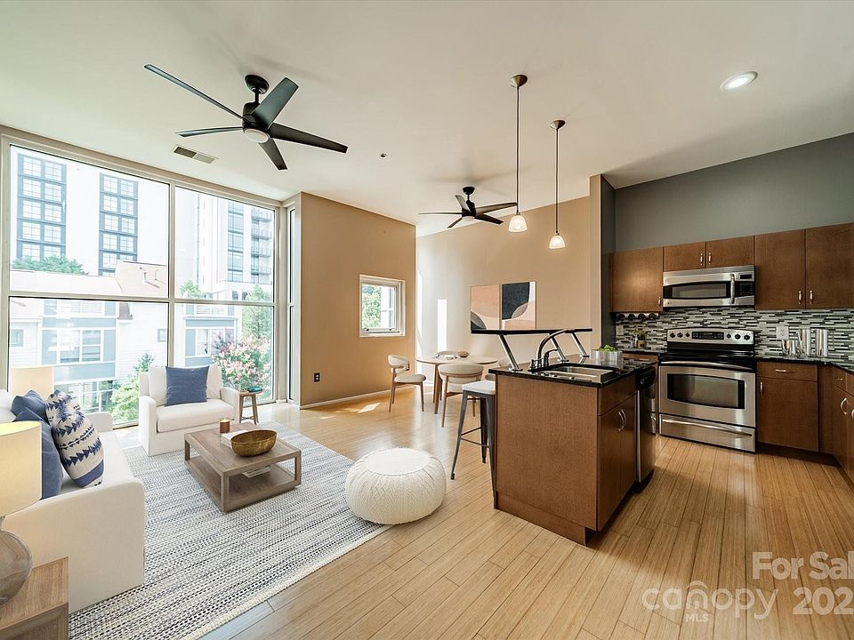Beautiful, well maintained Condo in Dilworth! Floor to ceiling windows in the Living Room and Bamboo floors throughout the main living areas. Wonderful kitchen with island/breakfast bar with granite countertops and high-end fixtures throughout. Large Primary bedroom with two closets with stackable w/d in the Primary bath. Great location! Shopping, restaurants, pubs, light rail and more within walking distance and just over a mile to BofA Stadium. Covered parking available on a first come basis. Put this one on your radar! Seller is willing to credit Buyer with HOA dues at closing.