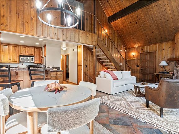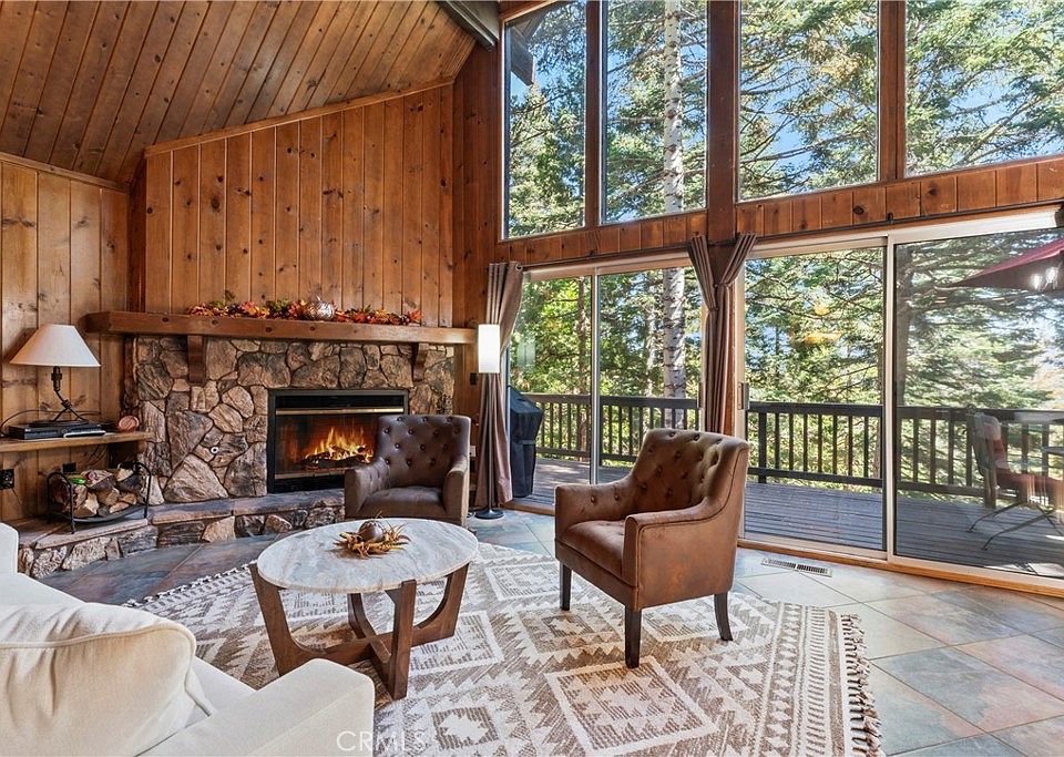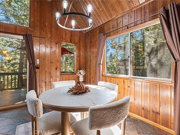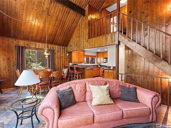 Lake Views from two decks in a Classic Mountain Cabin A-Frame with Lake Rights. Open the front door to where an open floor plan awaits. An expansive two-story Cathedral ceiling roofline opens out to a large deck the full length of the home. Design includes a corner Lava rock fireplace, extra wide sliders, large bank of windows that anchor the living and dining room, extra wide tongue & groove plank paneling combined with great views of Lake Arrowhead and the Lake Arrowhead Village. The kitchen and island/bar are accented in rich, rust brown granite, stainless steel appliances and oversized slate tile flooring throughout. A coveted large bedroom with a huge, full bath is on the first level.
