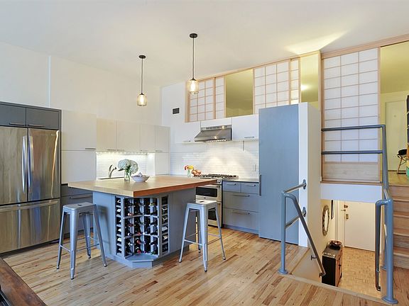 Stunning, unique and luxurious. This three level loft located on Prospect Park West has it all. Your private entrance on PPW allows you to enter your home as if it were your own townhouse. Open plan loft living and dining surround you with soaring ceilings complete with wood burning fireplace and plenty of space to entertain and relax. The custom gut renovated kitchen is fabulous. Custom cabinetry and top of the line appliances surround a versatile kitchen island that doubles as a dining room table with a swift and easy glide. Underneath this amazing island store your wine collection in a tidy and elegant way. There is a full size washer and dryer tucked into the kitchen millwork for house-keeping ease. Upstairs find a mezzanine loft which serves as the master with a large ensuite bathroom and lovely custom Japanese screens for privacy if needed. The lower level is complete with home office/nursery and another renovated full bath and loads and loads of storage. Gated parking out back comes with this amazing loft to round out the package! Amenities galore on PPW, gorgeous Prospect Park around the corner with its own South Slope farmers market every Wednesday, popular train lines close bye and a very cool restaurant and pub scene too to explore right at your fingertips...