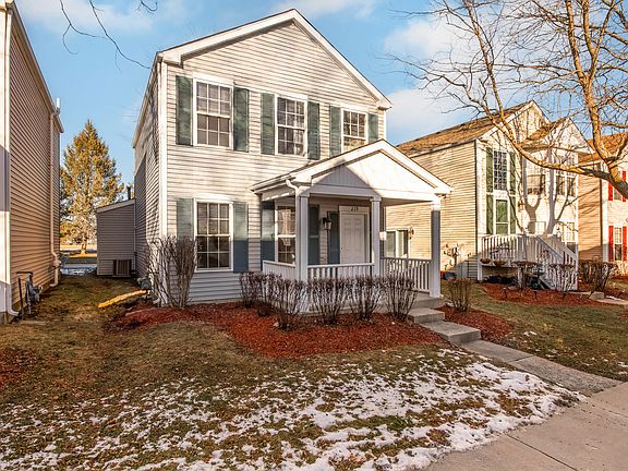 Light, bright and move in ready! This two-story home is located in the Hometown Subdivision of Oswego. Conveniently located within close proximity to parks, Downtown Oswego which has many shops, services, and activities for you to enjoy. Gleaming laminate flooring on the main level. Stainless steel appliances, tiled back splash, and solid service counter tops in the kitchen. Ceiling fans in every bedroom. White trim and doors throughout. Covered front porch, rear concrete patio. Two car attached garage. Lawn maintenance and snow removal provided by the HOA.