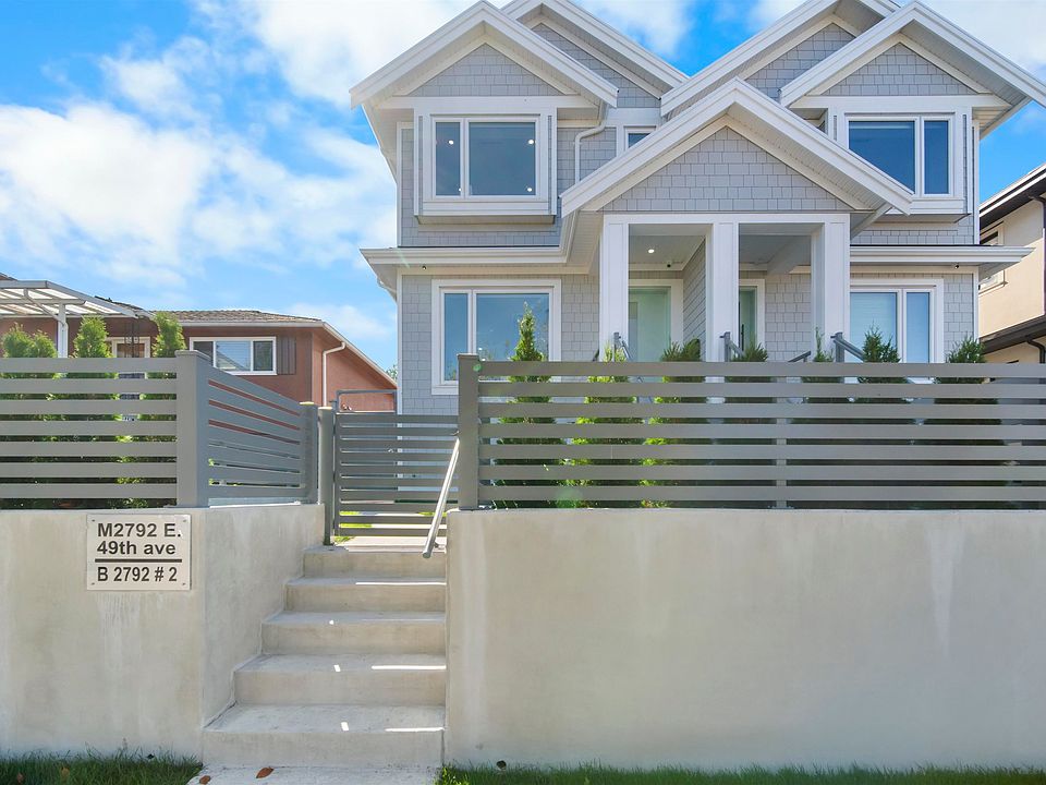Welcome to 2792 e 49th Ave- A Stunning Brand-New Duplex in the Heart of Killarney! This 1878 + sqft 5 bedrooms & 4 bathrooms family residence offers a bright open concept main floor, 3 spacious bdrms plus a 2 bedroom suite at the basement, a great mortgage helper. Built with quality craftsmanship and attention to detail, this home provides both comfort and peace of mind. Features a chef-inspired kitchen,radiant heating,gleaming floors, HRV, A/C, Triple Glazed Windows, security system. Step outside to a covered deck off the kitchen-great for entertaining and BBQ's. South facing backyard. 2 parking spaces with EV charging.Close to parks, Killarney Community Centre, top-rated schools, shopping along Victoria Dr, and easy access to transit.This home blends style and everyday functionality.