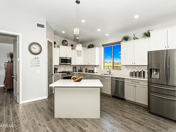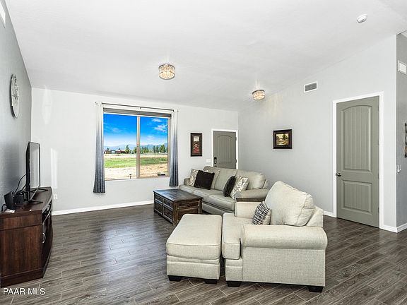 Located on a private dirt airstrip with direct runway access, this home sits on 5 premium acres of totally usable/flat/level property including a 10,000 square foot fenced backyard! This better than new construction home was completed in 2019 and features outstanding panoramic 360-degree views of the Mingus Mtn Range, Granite Mtn, and the surrounding vistas! Construction details include a post-tension slab utilizing a winter mix concrete, a tile roof, exterior shutters, enclosed facia, and an extra deep three-car garage!The interior features an open spacious split bedroom floorplan with a great room design concept, vaulted ceilings, and 8 ft interior doors. The entire interior of the house is wood grain plank tile flooring.The kitchen offers easy-care solid surface counters, upgraded staggered height cabinetry with crown moulding, soft close drawers/doors, a tile backsplash, a corner walk-in pantry, and Samsung stainless steel appliances including a microwave/convection oven that can also grill! The master suite is spacious in size and has a good-sized closet. The master bathroom provides a raised height, dual vanity, solid surface countertops, a walk-in shower and a convenient linen closet. Both guest bedrooms are good sized with ample closets. The full guest bathroom has a comfort height toilet The laundry room has additional added storage cabinetry as well as a hanging rack. The covered rear patio is a great place to enjoy the peaceful setting. Additional amenities include a water softening filtration system, a smart water heater with a recirculating pump, and a 12 by 32 detached insulated storage unit that could accommodate several side by sides or small cars.