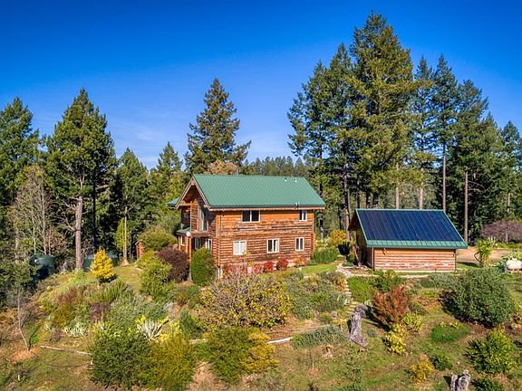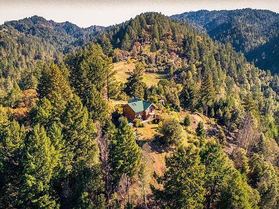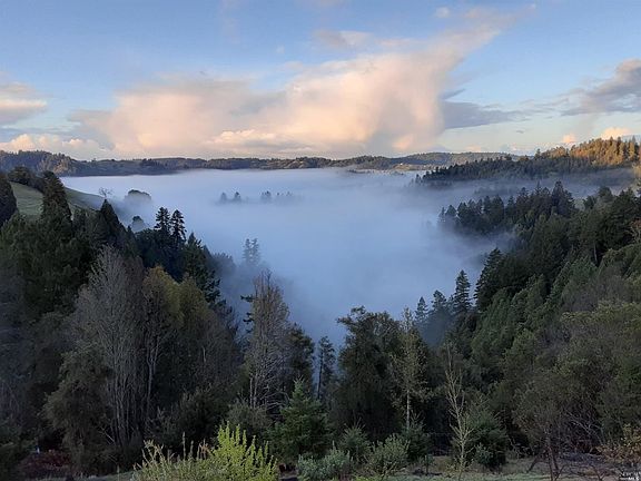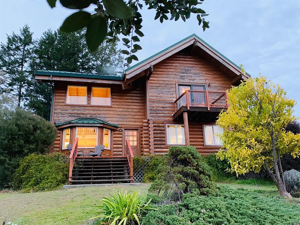 Significant price reduction on this 3 bedroom, 2 bath, 2,022 square foot log home with spectacular views in every direction. 40 unspoiled acres in the coastal hills with seasonal creeks on both ends of the property. The house sits at an elevation of 1,400 ft within 2 fenced acres of lush gardens. Mature fruit trees include citrus, fig, avocado and olive. This is a permitted off-grid home, with a deep well and large water storage tanks. High above the fog line, the coastal hills have a Mediterranean climate. With long dry summers, and mild but rainy winters, Cazadero is reputedly the second wettest town in California. Double height living room and a large first floor bedroom which is currently being used as an artist's studio. The primary bedroom has a small balcony for gorgeous sunsets. Detached two car garage supports solar panels on the metal roof and has a separate battery room. Work from home with internet and cell service. Near the coast, Russian River Valley and San Francisco