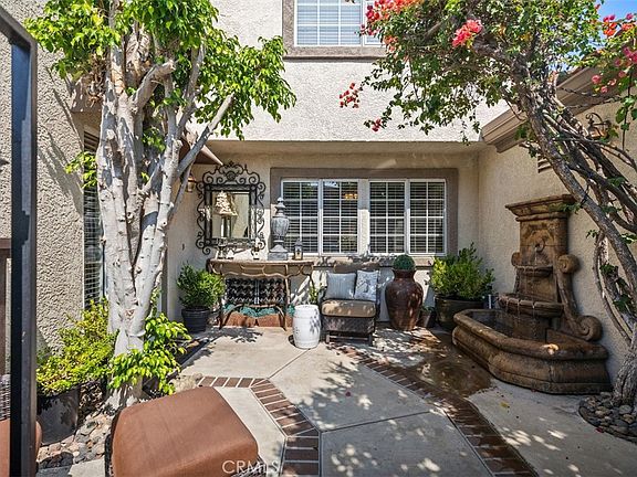 Sliding doors lead to a large, partially covered, wrap-around backyard—also fully furnished—perfect for relaxing or entertaining. Upstairs, the spacious primary suite offers high ceilings, a ceiling fan, private balcony, dual-sink vanity, and a walk-in closet. A secondary bedroom and full bathroom complete the upper level. Additional features include a whole-house fan, BRAND NEW A/C, custom paint, wood flooring, and a direct-access two-car garage with built-in shelving and an exhaust fan. All furnishings in the courtyard and backyard are included, along with a washer, dryer, and refrigerator. Located near Lake Mission Viejo, residents enjoy year-round boating and swimming, the popular Summer Sunset Concert Series with fireworks, access to two clubhouses, picnic areas, and a variety of community events.