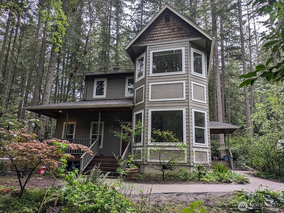 Well-built home on very quiet acreage near Tahlequah Ferry. Three bedrooms, 2.75 baths, hardwood floors on main level. Lovely primary suite with bonus room on upper level. Detached two-car garage plus carport. Near south-end trails on a dead-end street. Brand new roofs.