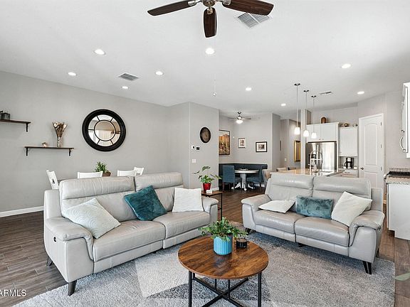 NEARLY NEW single level 4 bedroom home with a pool in this gated community. Walk to state of the art Fireside at Norterra community center! Take in the glorious sunsets in this private backyard. Spacious well-designed over 2000sf Bluebird floorplan. Beyond the front porch you'll find the den and dining room. The gorgeous gathering room is so fun for bringing guests together & opens to refreshing pool with baja step, covered patio, pergola, and firepit. Entertain in this island kitchen with white cabinets, gas stove, granite counters. Neutral wood plank tile flooring throughout. Primary Suite features walk-in designer closet , dual-sink vanity & super shower. Ideal split floorplan includes front bedroom with bath for guests, den & 2 bedrooms with bath. Epoxy garage floors Must see today Back Patio features power sunshades