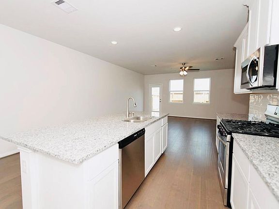 Nestled in the Charming Katy Community, this townhome boasts an open first floor layout merging a spacious family room with a stunning kitchen. The family room features impressive iron wood flooring, while the kitchen is adorned with 42" linen cabinets, Santorini kitchen backsplash, and coastal white granite countertops. Upstairs, the primary suite and secondary bedrooms offer ample space and natural light. The primary bath showcases large fair tiles and a walk-in shower. Enjoy the comfort and style of this amazing property in a desirable neighborhood.