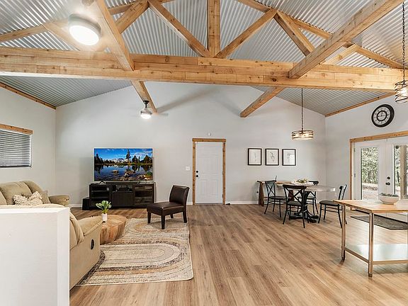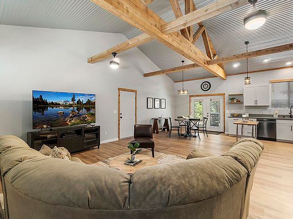 Brand New Industrial Farmhouse with plenty of room for ALL the toys! Covered parking for at least 8 vehicles!! This zero step rancher has it all: Open floor plan with great room off kitchen. Includes all black stainless appliances, quartz counters, & gas range. Covered 10x20 back patio off informal dining. LVP wood floors throughout home & vaulted corrugated metal ceilings. Laundry room which doubles as large pantry/utility room has butcher block topped cabinets. Instant hot gas H2O heater, 90% energy efficient heatpump, smart home thermostat, security system. Primary bed on-suite has walk-in shower & double farmhouse sinks. All this plus attached 25x30 garage w/ 14' doors. 30x40 RV Garage complete w/ both 30 & 50 amp hookups along with RV septic & water plumbed. Separate 24x36 detached shop w/ 9' garage doors. Low maintenance natural landscaping. No HOA. Horses allowed. All this off paved roads on almost 3 private wooded acres. Ask agent about free home warranty.