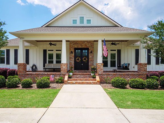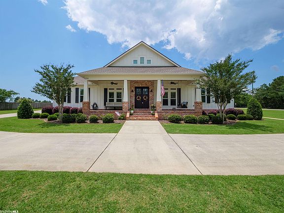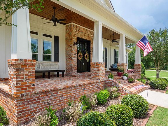 Custom built in 2014 by ARK Builders. One owner. Gunite spa is heated & cooled with a rock waterfall. Updates: LVP flooring, new quartz counters in kitchen & baths 2 & 3; new interior & back porch fans; freshly sanded, stained & sealed porch ceilings and front door; recently painted walls and cabinets. Entire front & back yards were just re-sodded with Zoysia grass & has an irrigation system; septic system; privacy fenced; and a semi-circular driveway with more parking in the back. There is a detached dual storage area, one bay can house a boat and there is a breezeway between the two for RV or boat parking. The attached 2 1/2 garage has epoxy floors & shelving. The front and back porches have hand-cut reclaimed herringbone laid brick floors. Bedroom 3 is being used as an office; bedroom 4 is also being used as a home office and has 3 built-ins desk areas (easily removed & walls repainted) and has an exterior door. Foyer has a reclaimed brick wall and brick arch that opens to the dining room. Oversized wood burning fireplace with gas starter, built-in cabinets and over cabinet lighting in GR. The kitchen has a walk-in pantry, stainless steel appliances, farmhouse sink, granite counters, an island, under and over cabinet lighting, Pottery Barn pendant lighting, microwave | oven combo with additional antique-look AGA gas range with a pot filler over it, in cabinet lift for a mixer, hot water dispenser, breakfast bar and wine bar with wine fridge. The breakfast room has built in benches with storage. Impact windows throughout, 2 heated and cooled storage rooms, central vac, tankless water heater, whole house dehumidifier, whole house generator, security system and plantation shutters. The master en-suite boasts a gas log fireplace, black out shades, dual walk-in closets, air bubbler oversized soaking tub, dual vanities, linen closet, quartzite counters, water closet and opens to the laundry room. The listing agent is licensed in the State of Alabama and is the seller.