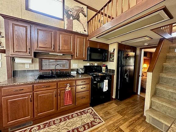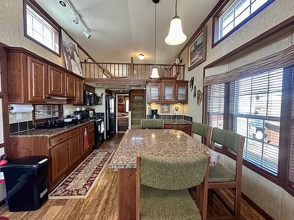 Escape to Your Perfect Retreat in the gated community of Woodsmoke Ranch! Situated on a prime pond-facing lot, this charming, one-owner home has been meticulously maintained and cared for, offering the perfect getaway in the highly sought-after Woodsmoke Ranch camping community. Surrounded by mature trees and enhanced by the peaceful ambiance of the pond's three aerated fountains, this lot provides a serene and picturesque setting for relaxation and outdoor enjoyment. Step onto the covered deck or retreat to the carpeted, enclosed screened porch, perfect for unwinding while listening to the soothing sounds of nature. Gather around the inviting firepit for cozy evenings under the stars and take advantage of the spacious shed for all your storage needs (even has electric!). Nice long driveway for parking & there are two additional guest parking spots nearby, hosting friends and family is effortless. Inside, the bright and open living area is designed for both comfort and style. The luxurious vinyl flooring extends throughout the living room and kitchen, offering the timeless look of hardwood with easy maintenance. The living room boasts canned lighting, an elegant electric fireplace, and expansive windows fitted with faux wood blinds, filling the space with warmth and natural light. The kitchen is a chef's delight, featuring a designated eating area, a stylish coffee bar, and sleek laminate countertops with a high-end granite look. The loft area, complete with carpet, lighting, windows, and a charming wood railing, provides 2 additional sleeping or lounging areas. The main bedroom offers a tranquil retreat, with plush carpeting, ample windows, built-in lighting & lots of storage. The full bathroom is thoughtfully designed with a tub-shower combo, vanity sink, toilet, and a window for natural ventilation. Located within a short walking distance to an array of top-tier amenities-including 2 swimming pools, game room, cafe, convenience store, adult lounge, playgrounds, three open pavilions, stocked ponds for fishing, basketball courts, baseball fields, sand volleyball, bags, remote control car racetrack and the ranch laundromat-offering the perfect blend of convenience and resort-style living with planned events throughout the year. Bring the horses too, they can stay in the Rentable Stables with pasture! Enjoy low annual property taxes and the benefits of coveted Category 1 HOA fees which are one of the lowest in the community at $1593.32 for the year- which includes water, electric & garbage! This is a part time campground community- no more than 182 days of occupancy per year. Don't miss your opportunity to own this beautifully maintained retreat in Woodsmoke Ranch and create many memorable moments with friends and family! Schedule your private showing today!