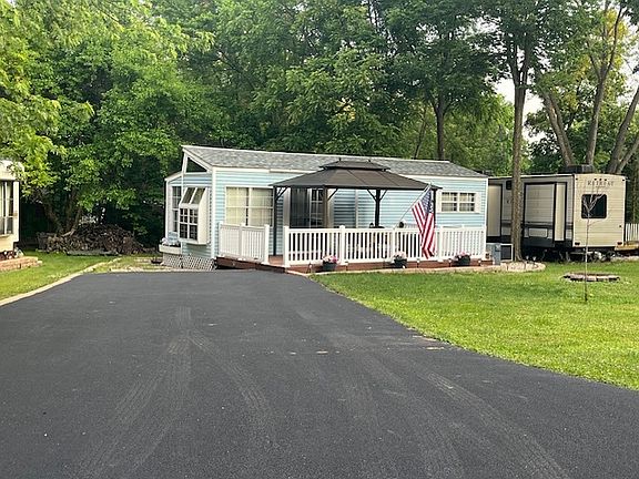Located at lot 307 within the gated community of Woodsmoke Ranch in Seneca, IL, this charming 1988 Holiday Garden Park Model offers a cozy and functional layout with unique architectural touches. The one-bedroom unit features a spacious carpeted living room with soaring ceilings, upper transom windows, a large picture window, and two brand new sliding glass doors-one leading to a front deck with a gazebo and the other to a private back deck. The kitchen boasts an abundance of cabinetry, a breakfast bar, pantry cabinet, and full-size appliances, all of which stay. The full bathroom includes a tub/shower combo, vanity with ample storage, and a medicine cabinet. The master bedroom offers a generous built-in closet and a custom corner headboard that allows flexible bed placement, along with the continuation of the tall ceilings and windows for a bright, open feel. Additional highlights include a shed for storage, a paved driveway, and a new roof installed in 2022. This is a category 2 lot with yearly dues of 1770.46 which includes water, electric, garbage and park amenities. Woodsmoke Ranch amenities: 2 pools, 2 stocked fishing ponds, 3 pavilions, basketball courts, sand volleyball, gaga ball, bags, 2 playgrounds, RC car racetrack, baseball field, laundromat, convenience store, cafe, horse stables (for rent), adult lounge, Mygrain Saloon, events planned year long and so much more. RV campground community, cannot be a primary residence. Gated community; showings by appointment only. No access without an appointment.