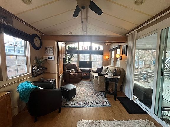 Welcome to lot 319 in the highly sought-after Woodsmoke Ranch Campground, featuring a fully furnished 1991 Kropf park model set in a serene location overlooking a picturesque ravine. This inviting retreat offers a flexible floor plan with a bright living room that includes an accordion wall, allowing the space to easily convert into an additional bedroom. High ceilings in both the living room and eat-in kitchen enhance the open, airy feel, while an abundance of windows fills the space with natural light and showcases beautiful ravine views. The kitchen features charming shiplap walls, ample cabinetry-including an additional set of cabinets near the table area for extra storage-a refrigerator approximately two years old, and a newer microwave. The entire interior has been freshly painted and updated with new wood laminate flooring throughout, complemented by new carpet in the primary bedroom and new blinds throughout. The primary bedroom includes built-in closet and dresser storage, while the loft provides excellent additional sleeping space or convenient storage. The full bathroom offers a tub/shower combination. Sliding glass doors lead to a private deck designed for relaxation and seclusion, creating a true outdoor oasis. Unique to this property is a charming bridge that connects the driveway to the park model, adding both character and functionality. Additional highlights include two gravel driveways, beautifully landscaped grounds with flowers, a fire pit for evening gatherings, and a storage shed, making this an exceptional opportunity to enjoy peaceful camper living at Woodsmoke Ranch. Category 2 lot with yearly dues of $1832.43 which includes water, electric, garbage and park amenities. Woodsmoke Ranch amenities: 2 pools, 2 stocked fishing ponds, 3 pavilions, basketball courts, sand volleyball, gaga ball, bags, 2 playgrounds, RC car racetrack, baseball field, laundromat, convenience store, cafe, horse stables (for rent), adult lounge, Mygrain Saloon, events planned year long and so much more. RV campground community, cannot be a primary residence. Gated community; showings by appointment only. No access without an appointment.
